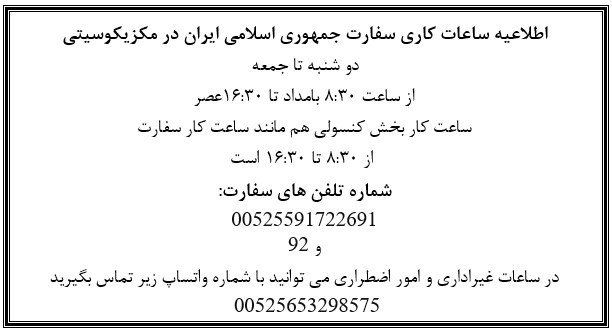 اطلاعیه ساعات کاری سفارت جمهوری اسلامی ایران در مکزیکوسیتی