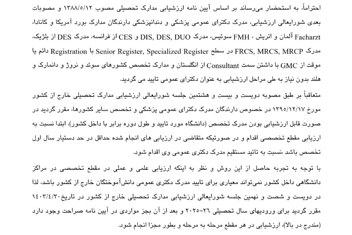مصوبه جدید وزارت بهداشت، درمان و آموزش پزشکی، درباره ارزشیابی مدارک تحصیلی فارغ التحصیلان ایرانی در رشته‌های پزشکی و دندانپزشکی
