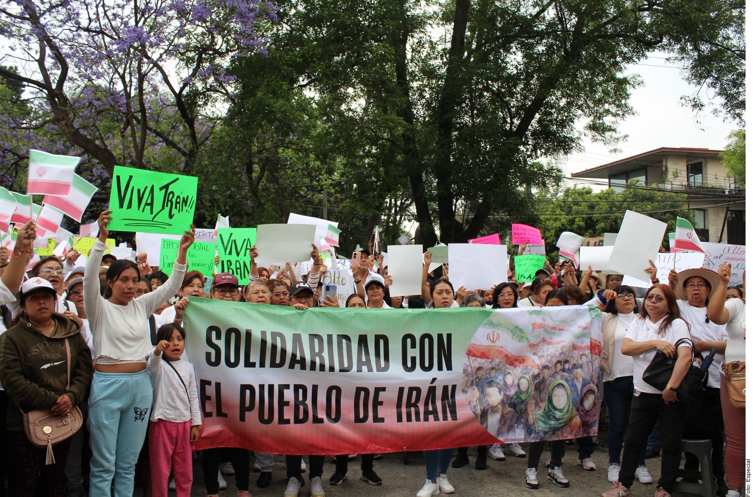 در تجمعی که در مقابل سفارتخانه، واقع در پاسئو د لا رفورما، برگزار شد، شرکتکنندگان پلاکاردهایی با پیامهایی مانند «مکزیک در کنار ایران ایستاده است» و «فرزندان ایران شایسته زندگی در صلح هستند» و همچنین عکسهایی از دختران کشته شده در حمله به مدرسه شجره طیبه در میناب، که در آن ۱۶۸ نفر، عمدتاً کودک، کشته شدند، در دست داشتند.